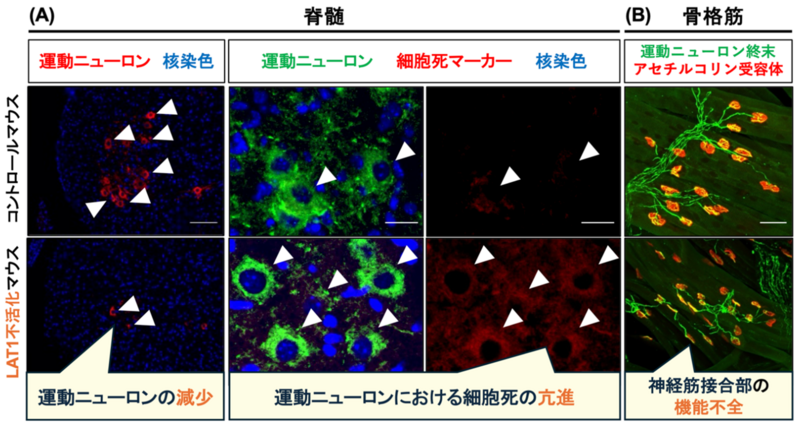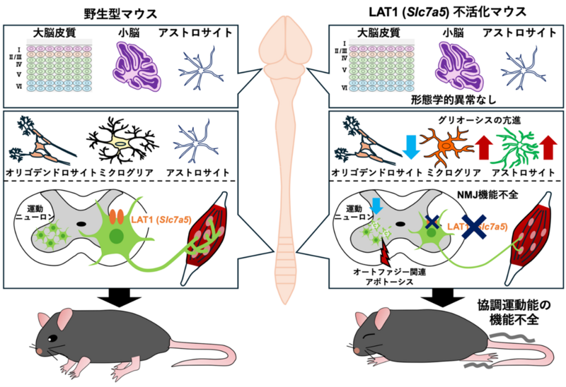 本研究では,神経細胞のアミノ酸トランスポーターL-type amino acid transporter 1(LAT1)(遺伝子名:Slc7a5)(※2)の不活化が,新生児期の脊髄運動ニューロン(※3)の変性と神経筋接合部(※4)の機能不全,およびそれらに伴う協調運動(※5)障害を引き起こすことを発見し,LAT1が運動ニューロンへのアミノ酸供給と協調運動能の形成に重要な役割を担っていることを明らかにしました。本研究成果は,神経細胞のアミノ酸トランスポーターを標的とした運動ニューロン疾患に対する新規治療・診断法の開発に貢献することが期待されます。