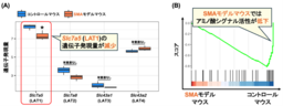 脊髄性筋萎縮症(spinal muscular atrophy: SMA)は,脊髄内の重要な神経細胞である運動ニューロンの脱落によって,脳から筋肉への信号が伝わらなくなり,徐々に筋力の低下や萎縮が起こる下位運動ニューロン病の1つです。研究グループは最後に,バイオインフォマティクス解析(※6)を用いて,「アミノ酸シグナルと下位運動ニューロン病との関係性」を明らかにすることを試みました。その結果,SMAモデルマウスの運動ニューロンでは,LAT1の遺伝子発現量とアミノ酸シグナル活性の低下が認められました(図3A-3B)。