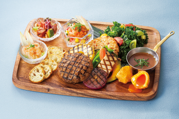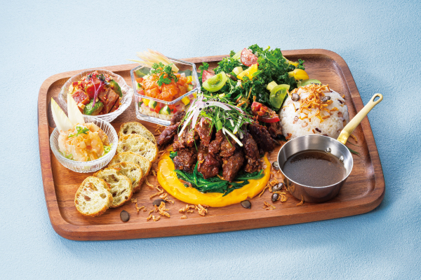 ハワイの定番料理「ロコモコ」を、ワンプレートスタイルでご提供いたします。ロコモコは表面を香ばしく揚げ焼きしたライスと、厚めに仕立てたボリューミーなハンバーグ、揚げポーチドエッグで構成。ロコモコに欠かせない卵はポーチドエッグを揚げることで衣の食感と半熟の黄身のコントラストを引き出しました。そこにバルサミコ風味の赤玉ねぎを添えることで爽やかな酸味が加わり、ハンバーグの旨味を引き立てます。付け合わせは、直火で焼いたエリンギ、ゴールデンパインとケールのサラダ。さらに、「ポケ トリオ」を同じプレートに盛り込み、コース仕立てのような満足感を実現しました。