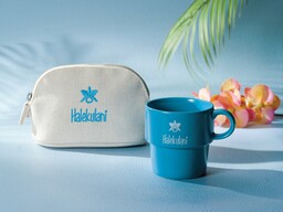 表面にハレクラニロゴマーク、裏面に帝国ホテルロゴマークをあしらった、オリジナルポーチです。リネンのような手触りでハワイらしさをイメージし、内側はハレクラニブルーの布地で仕立てました。