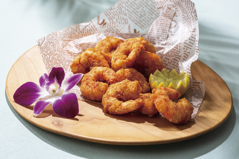 白醤油やごま油をベースに、唐辛子とチリソース、マヨネーズを合わせた特製スパイシーソースで、ボイルした海老を和えました。玉ねぎの辛味が海老の甘みを引き立てます。仕上げに散らしたココナッツチップスのサクサクとした食感とトロピカルな風味がハワイらしい一品です。