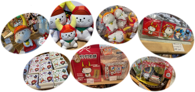 例:ひこにゃんぬいぐるみ、キーホルダー、文房具、お菓子、その他関連商品など