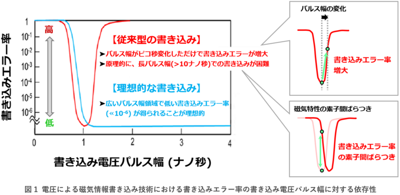 産総研では電子の持つスピンの性質を利用する技術「スピントロニクス」を活用し、電流ではなく電圧で電子のスピン状態を制御して情報を書き込む電圧書き込み方式(VC方式)のMRAMを提案し、研究開発を行ってきました(2016年12月5日 産総研プレス発表)。この方式を用いることで、待機中の電力だけでなく書き込み時の消費電力も大幅に減らすことができるため、より省エネルギーなメモリー素子の実現が期待されています。さらに、産総研では界面制御によって制御効率を向上できることも実証しています(2017年12月1日 産総研プレス発表)。しかし、従来手法である電圧磁気異方性制御(VCMA)効果を活用した「電圧誘起ダイナミック磁化反転法」では、図1のように、安定した書き込みができる電圧パルス幅領域は非常に限られており、1ナノ秒(10億分の1秒)程度というごく限られた特定のパルス幅をもつ電圧パルスを使ってスピンを反転させる必要があることから、書き込み電圧パルスのわずかな変化や素子の特性のばらつきの影響を受けやすく、書き込みエラーが起きやすいという問題がありました。メモリー応用を目指すためには10−6を下回る低い書き込みエラー率(書き込み試行回数に対して、書き込みエラーが起きる割合)を達成することが必要であり、大容量メモリーを安定に動作させるためには、広いパルス幅領域にわたって安定した書き込みを可能とする新たな技術の開発が求められていました。
