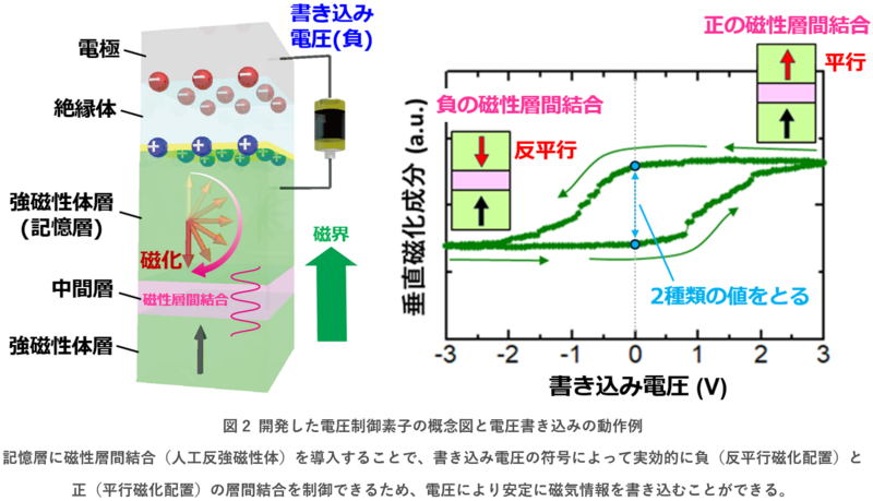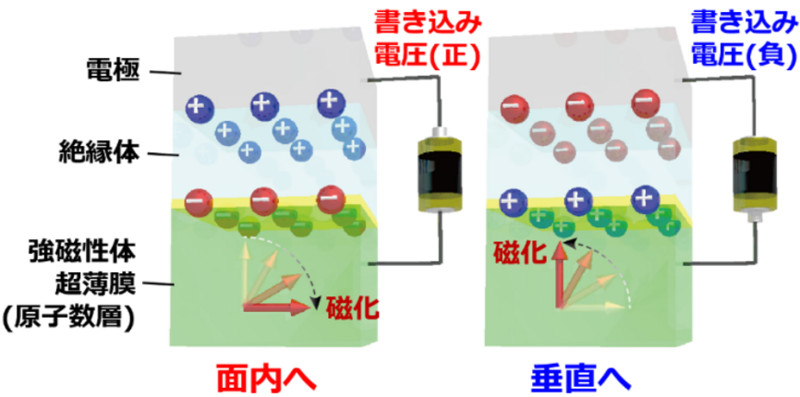 磁気異方性は通常、結晶構造や強磁性体の形状などに起因した材料に固有のものだが、強磁性体超薄膜に対して電圧をかけると磁気異方性が変化する現象が2009年に発見された。この現象は「電圧磁気異方性制御(VCMA)効果」と呼ばれている。さらに2012年には、この効果を使ってパルス電圧で磁化を高速に切り替える方法「電圧誘起ダイナミック磁化反転法」が開発され、低消費電力な磁気情報書き込み技術として注目されている。