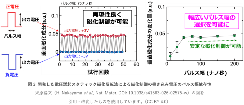 この電圧書き込み手法の優位性を確かめるため、従来の電圧誘起ダイナミック磁化反転法では用いることのできなかった数十ナノ秒という長いパルス幅での書き込みを試みました。図3(左)は電圧パルス幅を75ナノ秒に設定し、正電圧パルスと負電圧パルスを交互にかけた際の強磁性体薄膜における磁化変化量の測定結果を示しています。この結果から、電圧パルスにより高い再現性で磁化を制御できることがわかりました。また、図3(右)には、電圧パルス幅を変化させた場合の磁化変化量の測定結果を示しています。今回開発した「電圧誘起スタティック磁化反転法」では、通常は高速書き込みを行うことが難しい10マイクロメートル(10万分の1メートル)という大きなサイズの素子であるにもかかわらず、50ナノ秒での高速な書き込みができ、さらに、50ナノ秒より長いパルス幅の電圧パルスをかけた場合も安定して磁化を制御できることが実験的に明らかになりました。ワーキングメモリーではより高速な書き込み時間が求められますが、理論解析の結果、この方法では素子を100ナノメートル以下まで微細化すれば、パルス幅1ナノ秒程度の高速電圧パルスによる書き込みも可能であり、メモリーへの応用において有望であることが分かりました。