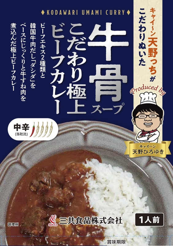 本品は、料理上手として知られる天野のこだわりが存分に詰まったレトルトカレー。「牛骨スープ こだわり極上のビーフカレー」は、韓国牛肉だし「ダシダ」がルーのベースとなっており、しっかりと煮込まれた牛すね肉との相性が抜群。「鶏白湯スープ こだわり旨辛チキンカレー」は、食べ応えのある鶏むね肉に加え、ウズラの玉子が入っているところがポイント。マイルドな鶏白湯スープがベースながらも、しっかりとスパイスが香る逸品。ゴロゴロの角切りポークが入った「豚骨スープ スパイシーポークカレー」は、豚骨スープのまろやかさとジンジャーやブラックペッパーのキレ味が調和。いずれも大人から子どもまで楽しめるカレーとなっています。