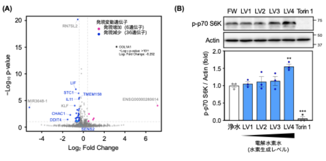 本研究では、抗がん剤感受性に関わる要因の一つとしてオートファジーに着目し、電解水素水がこの過程に影響するかを検証しました。まず、電解水素水投与によって細胞応答を網羅的遺伝子発現解析(RNA-seq)で解析したところ、細胞の成長・代謝制御に関わるmTORC1経路に関連する遺伝子群の変動が認められました(図1A)。さらに、mTORC1の代表的な下流分子であるp70 S6Kのリン酸化上昇も確認され、電解水素水がmTORC1シグナル活性化に関連する可能性が示されました(図1B) 。