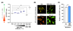 mTORC1シグナルは栄養状態を感知し、一般にその活性化はオートファジー抑制に関連します。そこで、オートファジーの「分解量(フラックス※6)」を評価できる複数の解析系を用いて、電解水素水の影響を検証しました。蛍光プローブGFP-LC3-RFP-LC3ΔG※7を用いたフラックス解析では、電解水素水の投与によりオートファジー活性の低下が認められました(図2A、2B)。また、栄養飢餓条件下で誘導されるオートファジーに対しても抑制傾向が確認されました(図2C)。これらの結果から、電解水素水がmTORC1シグナルの制御に関与することが示唆されました 。