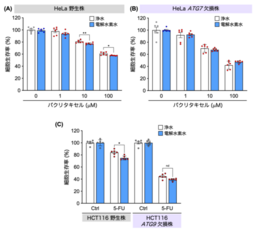 次に、電解水素水と抗がん剤との併用影響を細胞レベルで検証しました。まず、子宮頸がん細胞HeLaでは、同濃度のパクリタキセル投与条件において、浄水群に比べて電解水素水併用群で細胞生存率の低下が認められました(図3A)。一方、オートファジー関連遺伝子ATG7を欠損させた細胞(オートファジー活性を消失した細胞)では、この差は認められませんでした(図3B)。同様に、大腸がん細胞HCT116でも、5-フルオロウラシル(5-FU)投与条件下で、浄水群に比べて電解水素水併用群で細胞生存率の低下が認められましたが、オートファジー活性を消失したATG9欠損細胞ではこの差が消失しました(図3C)。これらの結果は、電解水素水による抗がん剤の感受性変化にオートファジーが関与する可能性を示しています 。