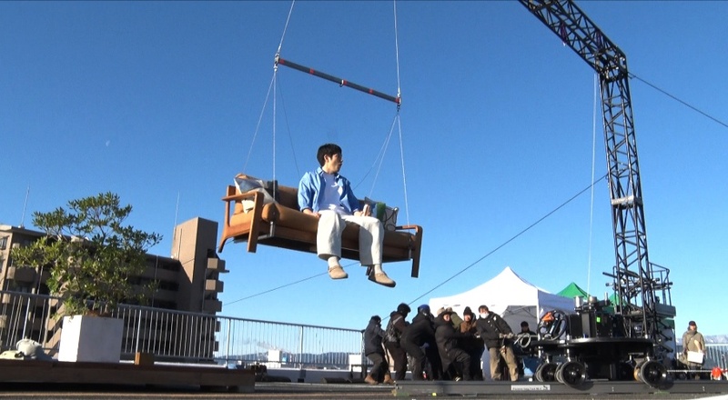 松山ケンイチさんが浮遊するソファーで自由に空を舞う!