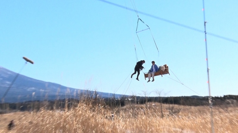 ソファーごと浮き上がるシーンは、専門家の指導の下、安全性に十分配慮しながら、大掛かりな仕掛けを用いて撮影が行われました。屋上テラスでの撮影では、ハーネスを着用した松山さんをワイヤーでトラス(仕掛けや人物などを固定するために使用する金属製の構造物)に固定。ソファーも別のワイヤーでトラスに固定し、滑車などを使いながら、スタッフ数人がかりでつり上げるという手法で撮影しました。本番前、「(浮上中は)何もしゃべらなくていいですよね」と尋ねた松山さんに対して、監督は「できれば、ちょっとしたニュアンスがほしいです」と回答。それを受けて、「おぉ~!」「どこへ行くのかな?」とアドリブを入れた松山さんは、「あははは、なんだこの絵(笑)」「面白いなぁ」と楽しそうに笑いながら、ご自身のプレイバック映像を確認していました。