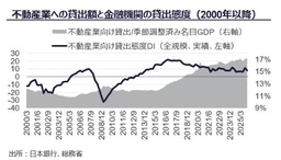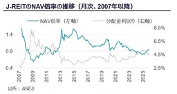 日本の実質GDP成長率は2026年を通して緩やかなプラス成長が見込まれる一方、米国の通商政策や世界経済の減速懸念など、外部環境の不透明感は依然として残る。こうした中、日本銀行は金融正常化の方向性を維持しつつ慎重な政策運営を継続している。不動産業向け貸出残高は名目GDP比で高水準を維持しており、金融機関の貸出態度も概ね前向きである。長期金利は2%台へ上昇したが、この金利上昇局面においても、事業用不動産ではオフィスや賃貸住宅をはじめとして、賃料上昇と高稼働率を背景にファンダメンタルズは底堅く推移している。株価上昇の影響でJ-REITの分配金利回りは縮小したが、NAV倍率は上昇し、足元では収益性や資産価値に基づく評価が意識され始めている。