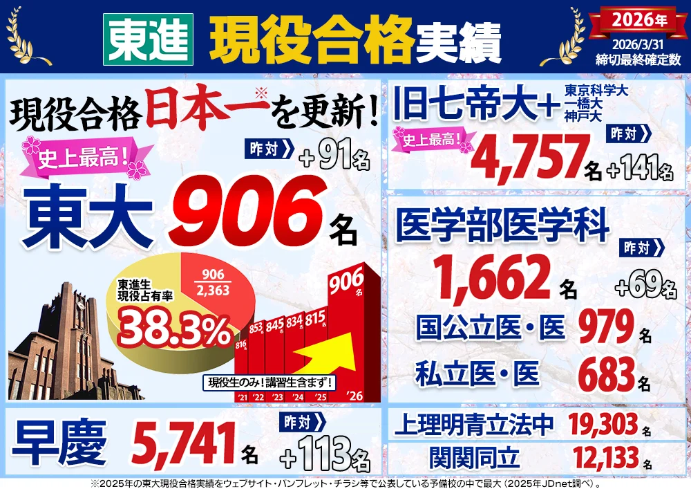 【最終確定】 2026年 東進 現役合格実績 [3/31締切] 東進生大躍進! 東大906名(昨対+91名)