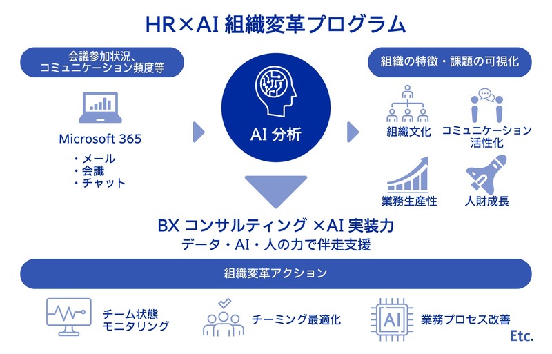 株式会社電通(本社:東京都港区、代表取締役 社長執行役員:松本 千里)は、株式会社電通総研(本社:東京都港区、代表取締役社長:岩本 浩久、以下「電通総研」)と、Microsoft 365※1のデータを起点に、組織課題※2の診断から施策立案・実行支援までを支援する「HR×AIの組織変革プログラム」を開発し、本日から提供を開始します。