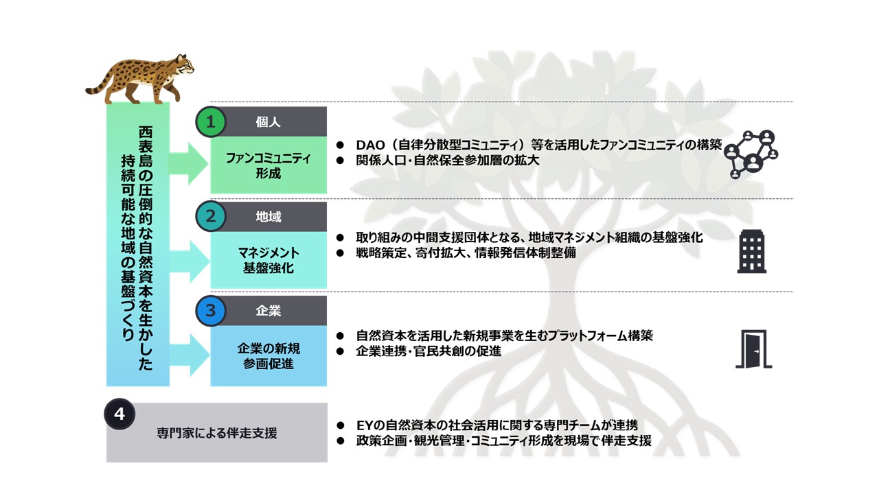 1.EYSCの自然資本・官民連携分野の専門チームが竹富町と連携し、現地への人員派遣も行いつつ政策企画・観光管理・コミュニティ形成を現場で伴走支援。