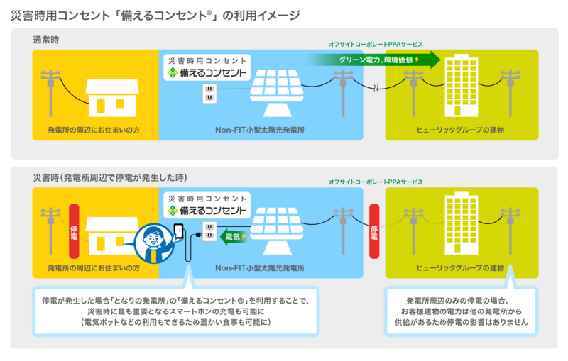 今回開発する非FIT小型太陽光発電所には、クリーンエナジーコネクトが提供する「備えるコンセントⓇ」を導入しています。「備えるコンセント」とは、発電所の設置地域で災害等により停電が発生した際、周辺にお住まいのみなさまが太陽光発電で発電した電気を利用することができる、災害時用コンセントです。これにより、発電所の設置地域における災害時の停電対策(レジリエンス向上)に貢献することを目指します。