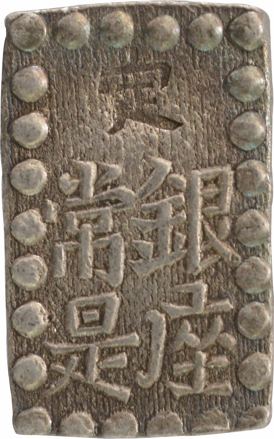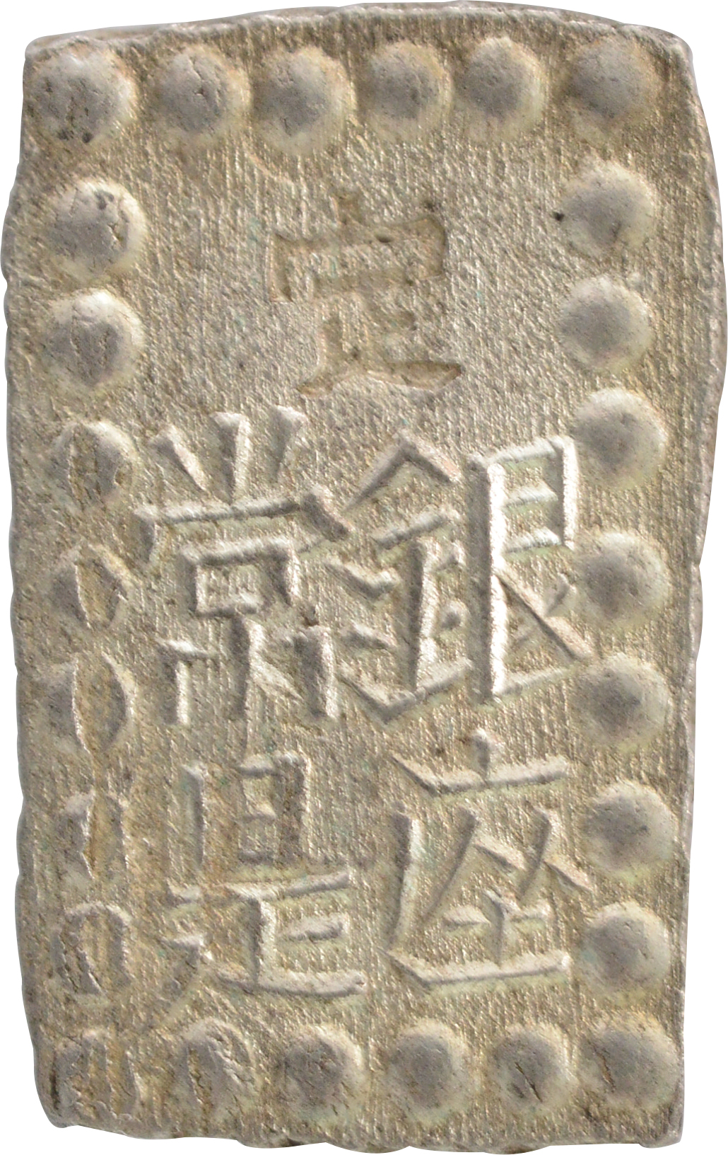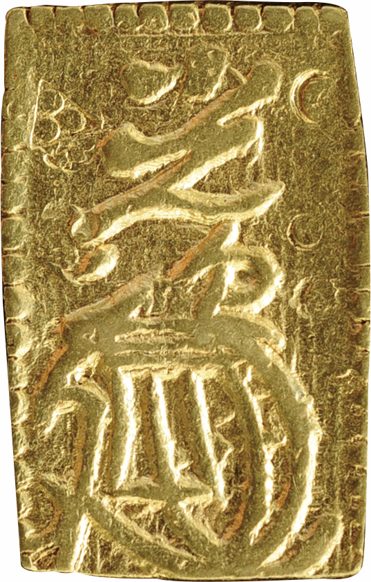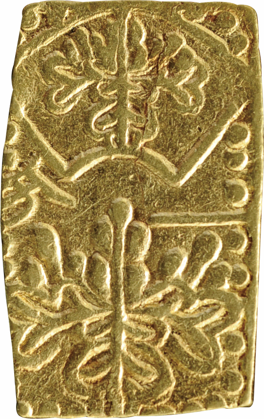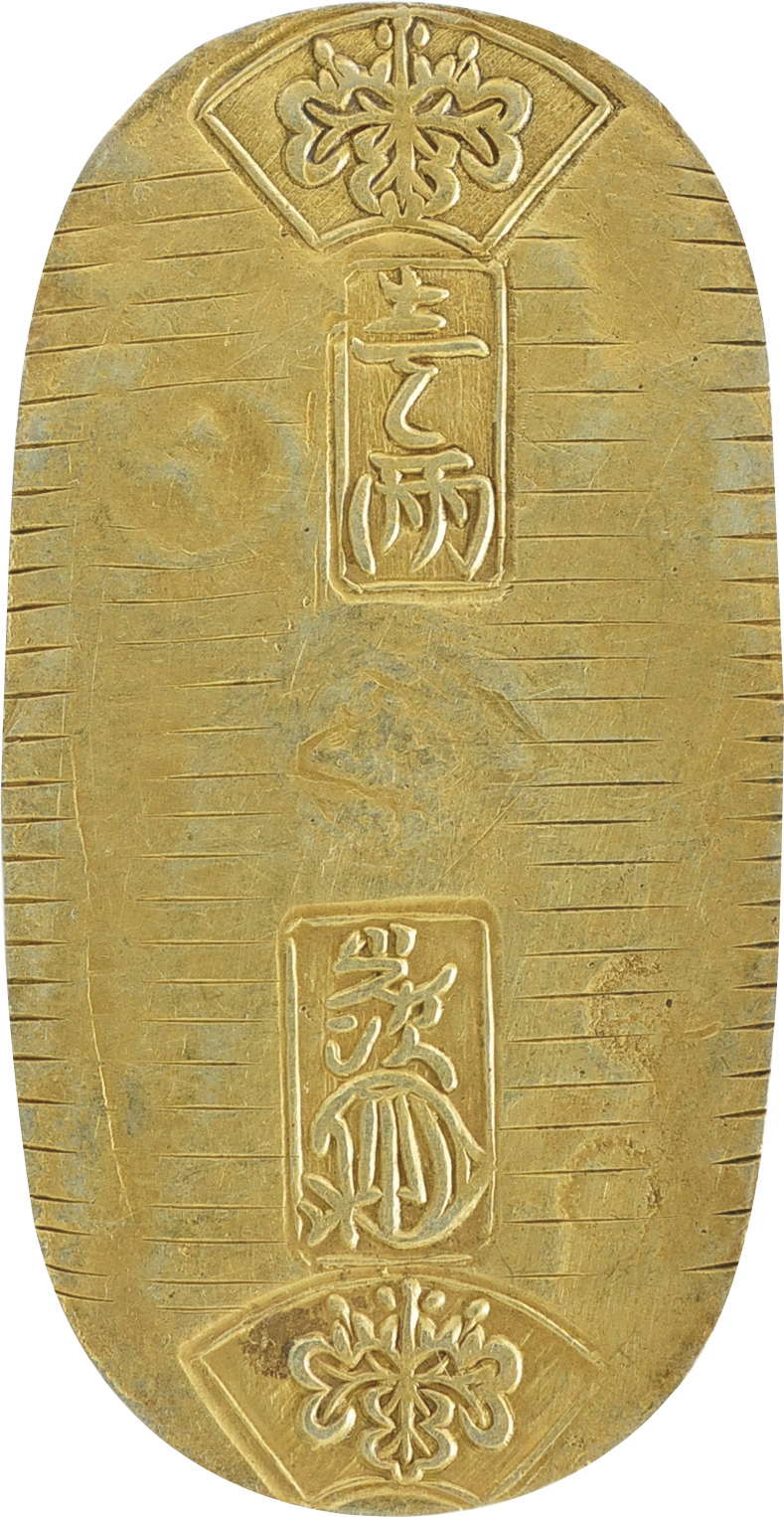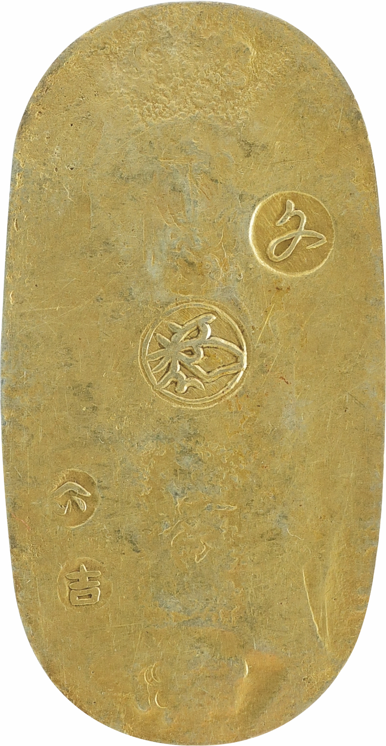 豊臣秀吉政権下において徳川家康が橋本庄三郎(後の後藤庄三郎光次)に命じて鋳造させた領内通用貨幣の武蔵墨書小判金を特別展示致します。天正大判金と同様の鎚目を施し、上下に扇枠の桐紋極印が打たれ、「壱両・光次・花押」、そして右側に「武蔵」の墨書が記されています。後の江戸期小判金の源流となる貨幣史において非常に重要な逸品です。さらに、文禄の役に際し、毛利氏が公用銀として差し出したとされる石州丁銀切遣いも並べて展示致します。いずれも現存数わずか数点の稀少品ですので是非この機会にご覧下さい。展示品は造幣局造幣博物館所蔵品です。