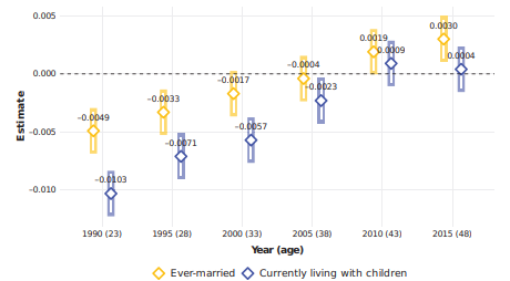 この図は、23歳から48歳までの各年齢において、教育機会をめぐる競争の緩和が家族形成に与える影響、教育の影響が年齢とともにどう変わるかを示しています。この図は、「これまでに結婚したか」と「現在子どもと同居しているか」という2つのアウトカムを追跡しており、若年期における遅れは徐々に小さくなり、40代半ばにはほぼ差がなくなることが分かります。これは、本研究の中心的な結論――女性の教育機会の拡大は家族形成のタイミングを遅らせるが、最終的な家族形成の達成度を低下させるものではない――を視覚的に示しています。