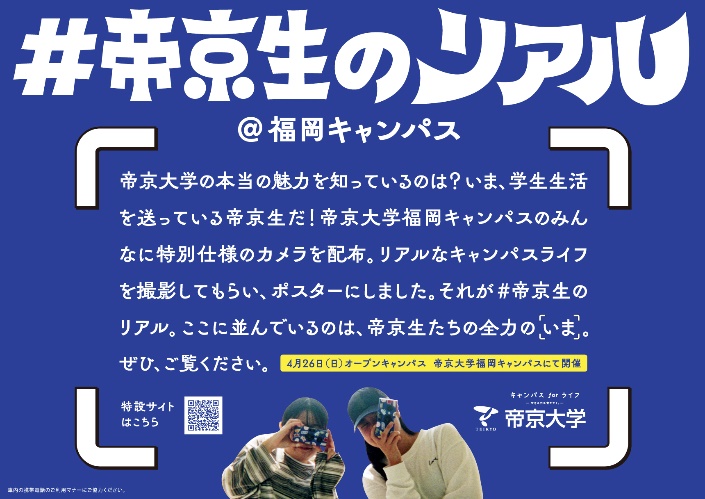 学校法⼈帝京⼤学(本部:東京都板橋区、理事長・学⻑:冲永佳史)は、本学学生がカメラマンとなって撮影した写真を使った「#帝京生のリアル」をInstagram(@teikyo_photo_project)で投稿しています。また、4月26日(日)の帝京大学福岡キャンパス オープンキャンパス開催にあわせて、4月20日(月)より写真を使った交通広告を西鉄福岡(天神)駅で掲出します。今年で4年目を迎える「#帝京生のリアル」では、帝京大学の本当の魅力を伝えるために、本学のことを最もよく知っている在学生に特別仕様のカメラを配布、リアルなキャンパスライフを撮影してもらう試みを実施。実際に撮影された写真を使った22種のグラフィック広告が完成。西鉄福岡(天神)駅にはおもに福岡キャンパスで撮影された8種を掲出いたします。グラフィック広告は八王子キャンパス、福岡キャンパスやそれぞれのキャンパス周辺でも今後展開していく予定です。