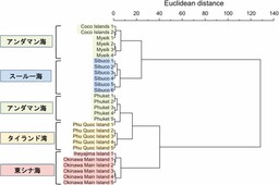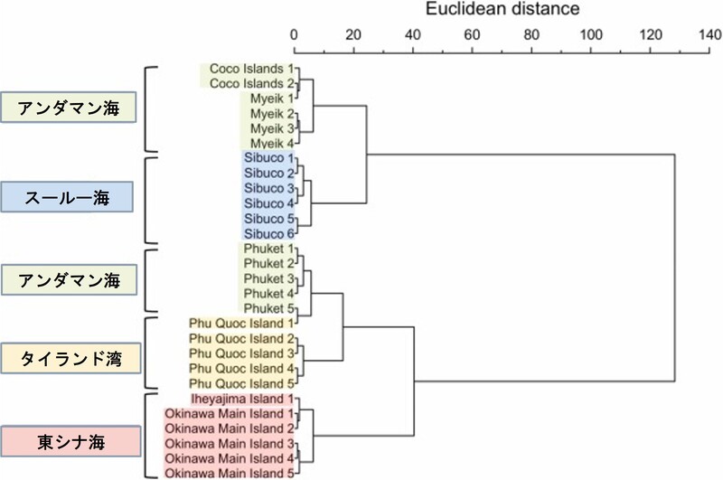 2)ICP-MSおよびICP-OESにより得られた各産地に共通して検出された7元素を用いたクラスター分析(※5)の結果、各試料はおおむね海域ごとにグループにまとまる傾向を示しました(図3)。