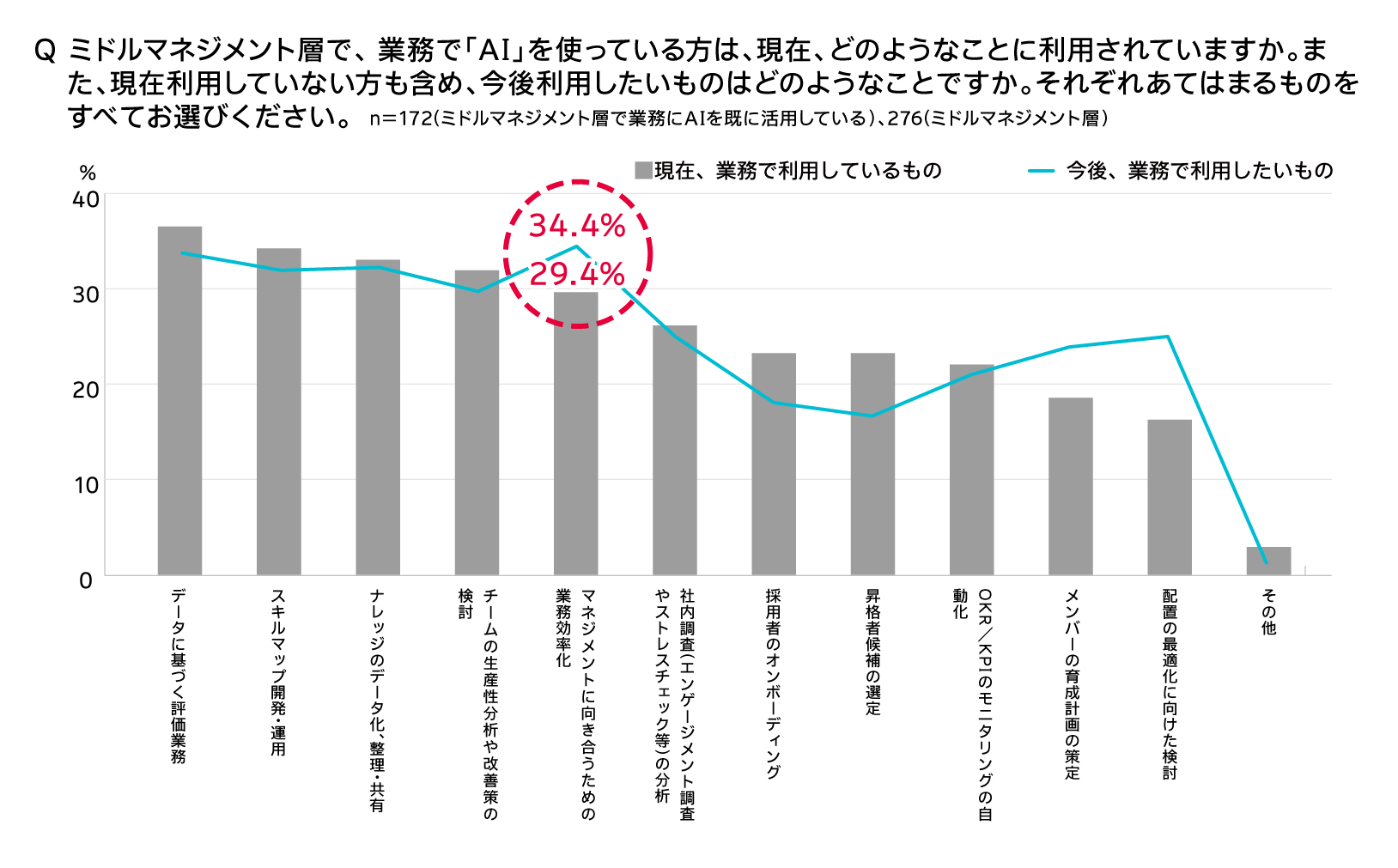 ・ミドルマネジメント層が今後AIを活用したい業務として「マネジメントに向き合うための業務効率化」が34.4%が高い一方で、現状の利用としては29.4%にとどまる。【図表9】