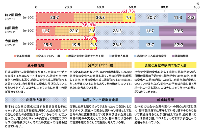 企業変革の中核人財「変革推進層」は2023年から3.6ポイント増加し15.3%、「変革フォロワー層」は微減も全体的な変革意識は回復傾向に。一方で、最大クラスターの“変化の必要性は理解していても、自分ごと化できない”「変革他人事層」が26.5%、「就業消極層」も22.2%と、企業変革に消極的な層が半数以上を占める結果に。