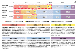 ①企業変革の中核人財「変革推進層」は2023年から3.6ポイント増加し15.3%、「変革フォロワー層」は微減も全体的な変革意識は回復傾向に。一方で、最大クラスターの“変化の必要性は理解していても、自分ごと化できない”「変革他人事層」が26.5%、「就業消極層」も22.2%と、企業変革に消極的な層が約半数を占める結果に。