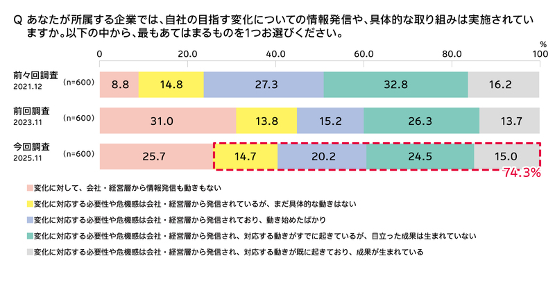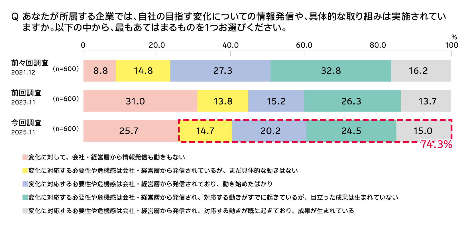 ・自社の目指す変化についての「情報発信がされている」と考える従業員の合計は前回調査から5.3ポイント上昇の74.3%で、15.0%は「対応する動きが既に起きており、成果が生まれている」と感じている。【図表2】
