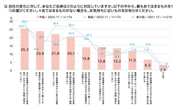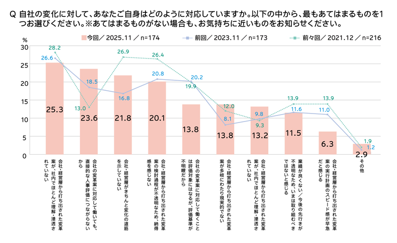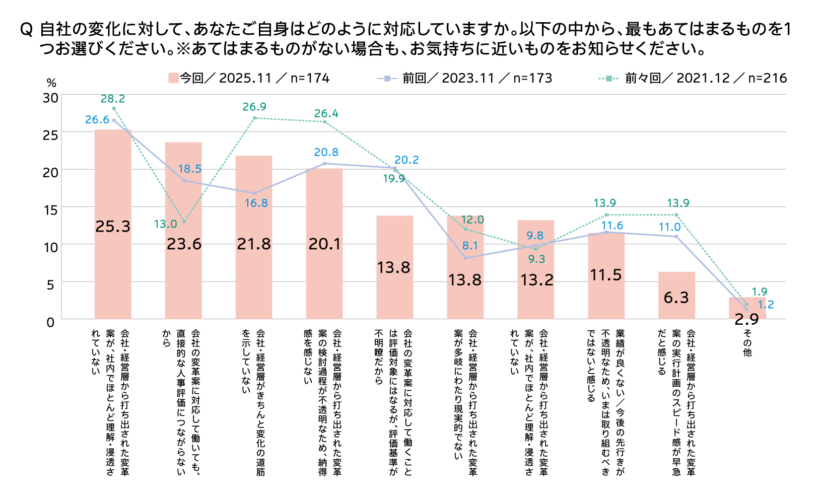 ・約4割の変革に否定的な層(うまくいかないと思う/正直ついていけない/自分は現業担当/関心がない)の理由は、前回調査に続き「会社・経営層から打ち出された変革案が社内でほとんど理解・浸透されていない」(25.3%)が最も多く、続いて「会社の変革案に対して働いても、直接的な人事評価につながらないから」が前回調査から5.1ポイント上昇し23.6%に。【図表4】