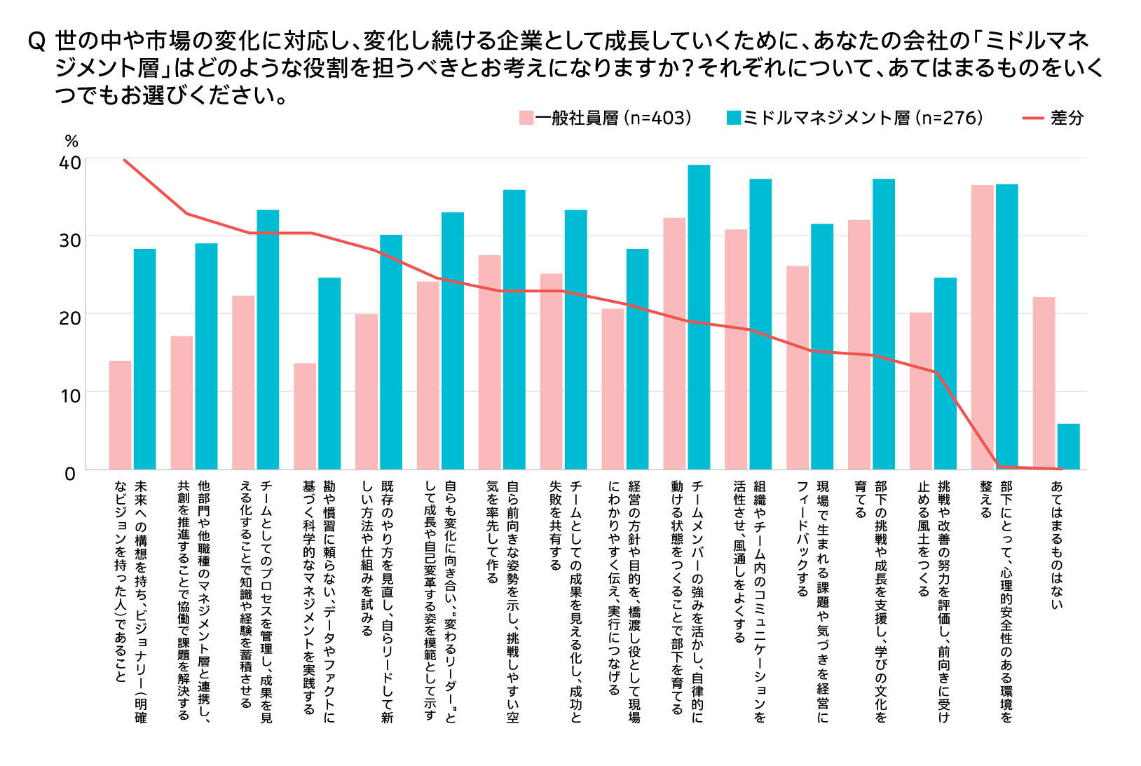 ・ミドルマネジメントが担うべき役割について、ミドルマネジメント・一般社員層ともに「心理的安全性」に関するスコアが高い一方で、「未来への構想やビジョンを持つ」「他部門・多職種のマネジメント層と連携した共創推進」「チームのプロセス管理や成果の可視化」など企業変革において重要なテーマで一般社員層のスコアが相対的に低く、期待にギャップが。【図表7】