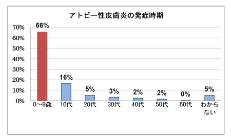 調査の結果、ご自身またはご家族にアトピー性皮膚炎の症状があるかを問う質問に、37%の人が「現在症状がある」もしくは「以前症状があった」と答えました。全体の3分の1以上の世帯にアトピー性皮膚炎発症経験者がいることが分かりました。世帯に発症経験者がいる方に発症時期を問うと、66%の人が10歳未満で発症しているという結果になりました。また、アレルギーの原因を調べる検査をしたことがない人が約半数を占めることがわかりました。