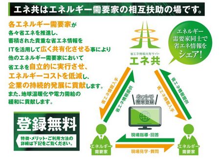 「エネ共」は、各エネルギー需要家が各々省エネを推進し、蓄積された貴重な省エネ情報をITを活用して広く共有化させる事により他のエネルギー需要家において省エネを自立的に実行させ、エネルギーコストを低減し、企業の持続的発展に貢献します。また、地球温暖化や電力需給の緩和に貢献します。