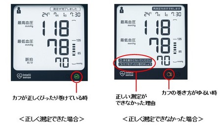 測定を開始すると、液晶画面上に「測定しています」という文字が表示されるとともに、カフ(腕帯)が適切な強さで正しく巻けているかをチェックして、マークでお知らせします。正しくぴったりと巻けているときには緑色のマークが点灯。カフの巻き方がゆるいときには、オレンジ色のマークに加えて「カフをぴったり巻きましょう」というメッセージも表示します。