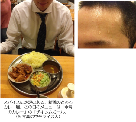 清水からは案の定大量の発汗が見て取れた。「もともと辛いモノ、そんなに得意ではないのですが、ここは体感する辛さと比較しても、いつも以上に汗が多いです。カレーは特に頭部からの汗が多く、体からはあまり汗が出ません」とのこと。佐久間の方もおもに頭部からの発汗が多い。頭部に限定される、というのもスパイスの力なのだろうか。なお、佐久間・清水両名ともに坊主のため、髪型が崩れる、などの心配はほぼ皆無である。また個人的な所感に過ぎないが、スパイスの刺激で新陳代謝が活発になったのか、はたまた血流が激しくなったからなのか、やる気に満ちた午後が迎えられた。