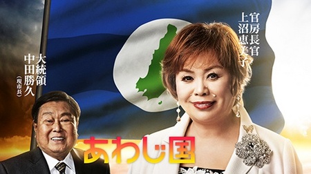 地域ケーブルテレビの「さんさんニュース」で新年度のPR方針を発表する中田市長と商工観光課の川上課長。別室のモニターで見守っていた南あわじ市出身の上沼恵美子さんが、PR方針の普通さに我慢できずスタジオへ乱入し、「あわじ国独立」を宣言します。突然の事態に戸惑う関係者たち。上沼さんはカメラに向けて独立の是非を問う国民投票を発表してしまいます。
