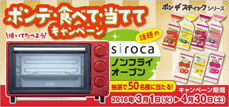 第一屋製パン株式会社(代表取締役社長:前川 智範)は、日頃のご愛顧に感謝をこめて、『ポンデ・食べて・当ててキャンペーン』を、2016年3月1日より2016年4月30日まで実施いたします。
