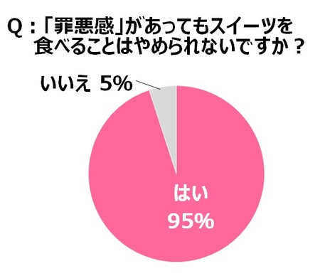 しかし一方で、「罪悪感」があってもスイーツを食べることはやめられないと答えた女性は95%。自分が嫌になるほどの「罪悪感」を抱いても、大好きな「スイーツ」はやめられない…そんな女性たちの複雑な胸中が垣間見える結果となりました。
