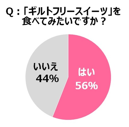 続いて、そんな女性たちに「ギルトフリースイーツ」を食べてみたいかきくと、56%が「はい」と回答。約6割がチャレンジしたいと考えているようです。