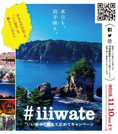 岩手県では、岩手の魅力や復興に取り組む岩手の姿を全国、そして世界に発信し、岩手の魅力をたくさんの人に知ってもらうために、今年4月から、Twitter、Instagram、そしてFacebookにおいて、「#iiiwate」を付けた投稿を促すキャンペーンを行っています。
