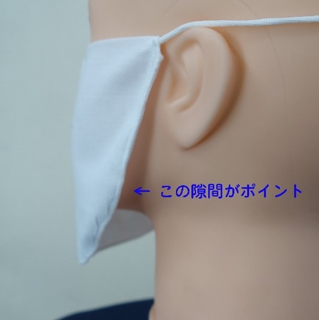 通常のプリーツ型不織布マスクを使った場合、口元の下部を締め付け、飛沫や吐息がマスクの上方へ排気されるのに対して、本品はマスクの下方つまり相手から遠い方向へ排気される構造になっております。