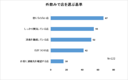 これから外で飲む時に心がけたいことでは、「席と席の間を広くとる」「ドリンクの回し飲 みはしない」「鍋物など皆でシェアする料理は避ける」の5割前後の得票があり、飲み会の三大要件になりそうです。
