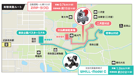 実証実験では、奈良公園内を誰もが快適に回遊できるようにするため、株式会社ZMPとWHILL株式会社の協力のもと、2種類の次世代型パーソナルモビリティによる移動支援サービスを実施します。実験中はどなたでも無料でお乗りいただけます。奈良公園へお越しの方は、ぜひご利用ください。なお、雨天の場合中止の可能性がございます。