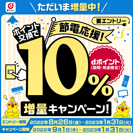 株式会社NTTドコモ(以下、ドコモ)は、電力供給を行う対象のdポイント提携店※のポイントをdポイントに交換いただくと、ポイントが10%増量になる「節電応援!ポイント交換でdポイント10%増量キャンペーン(以下、本キャンペーン)」を、2022年9月1日(木)から2023年1月31日(火)までの期間で開催いたします。