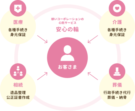 想いコーポレーションでは、日常生活支援から、病院や介護施設利用時に必要となる保証人代行サービス(身元保証)など、家族が担ってきたすべてのことをお引き受け出来る仕組みによって、終活サービス(終活相談)の提供を全国で展開しています。