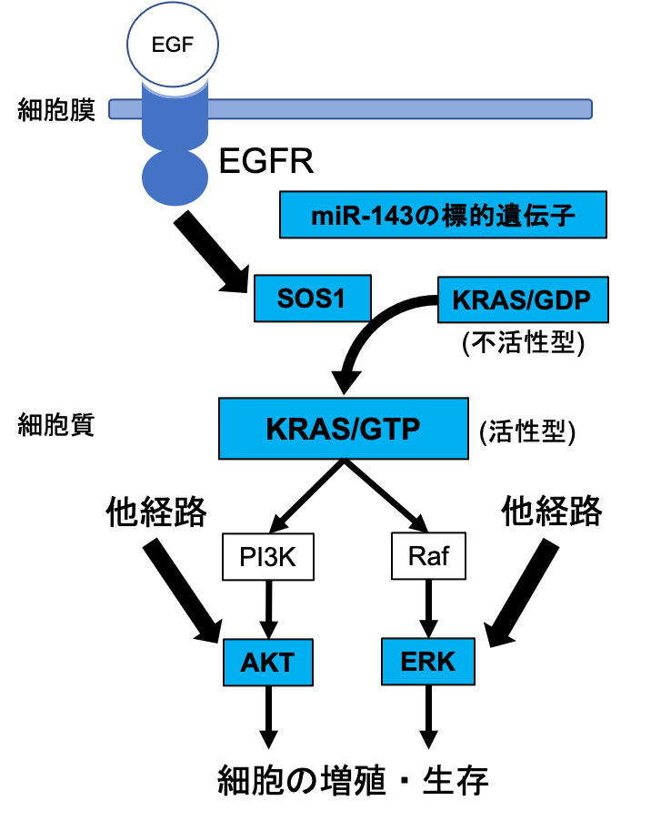RAS経路は、上流(EGFR)からの刺激をRASを介してAKTとERKへシグナルを伝えて細胞の増殖・生存に寄与します。RAS変異がんでは、常にRASが活性化型を維持し、AKT、ERKへのシグナルをオンにして、がん細胞の増殖・生存を促進しています。RASを抑制してもAKT、ERKへ他経路からシグナルが伝わるため、効果は一時的で、また、AKTまたはERKだけ抑制しても一方の経路が使えるため効果は弱いです。そこで、 miR-143#12でRASネットワーク(RAS、AKT、ERK、SOS1)を抑制することにより、がん細胞の増殖を抑制することができます。