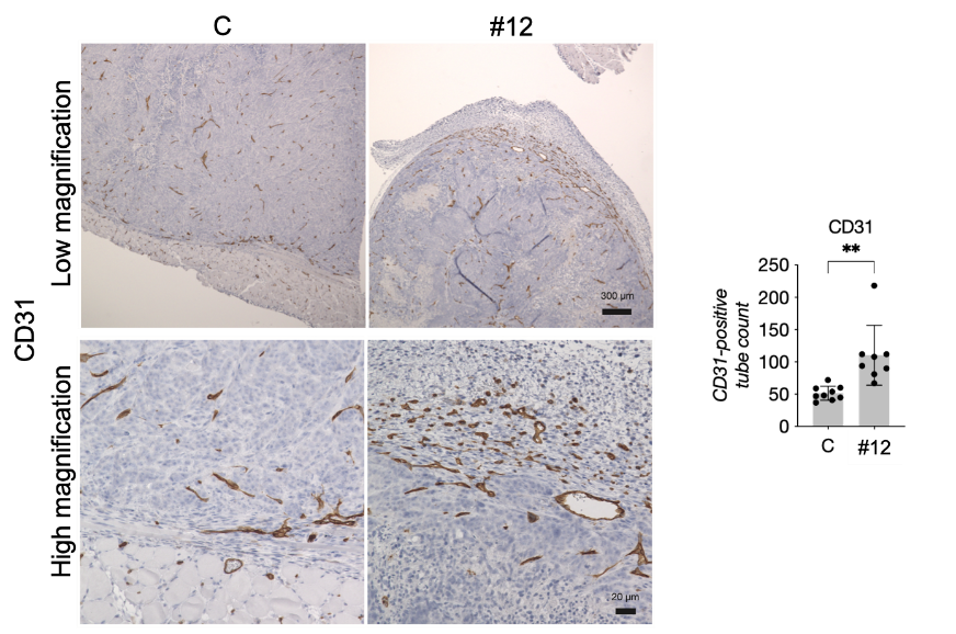 ヒト大腸がん細胞を皮下に移植したヌードマウスにmiR-143#12を局所投与した結果、低用量で顕著な腫瘍増殖抑制が示されました。投与されたマウス腫瘍サンプルにおけるタンパク発現では、RASネットワーク(RAS、AKT、ERK、SOS1)の発現が低下していました。in vitro(試験管内)実験でのmiR-143#12の効果は動物実験でも実証されました。さらに、新たな知見として、血管のマーカーであるCD31で腫瘍サンプルを染色すると、miR-143#12の浸透したであろう部位で顕著に染色が確認されました。つまり、miR-143#12は正常な血管新生を誘導し、自身の効果を増強した可能性が示唆されました(図4)。