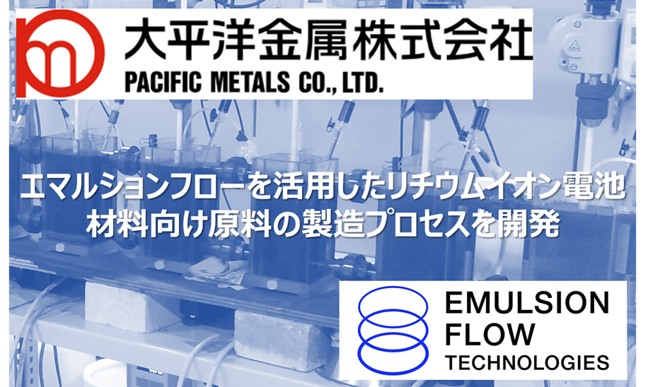 大平洋金属株式会社(本店所在地:東京都千代田区、代表取締役:青山正幸、以下大平洋金属)は、株式会社エマルションフローテクノロジーズ(本社所在地:茨城県那珂郡東海村、代表取締役:鈴木裕士、以下EFT)と共同で、エマルションフロー技術を活用したリチウムイオン電池(以下、LIB)材料向け原料の製造プロセス開発に成功いたしました。また、その製造プロセスの中の溶媒抽出工程において、コスト面を含め商業生産にも十分適用できる実用レベルのエマルションフロー溶媒抽出プロセスの開発に成功いたしました。