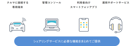 クルマに接続する専用端末、クラウド上の管理コンソール、利用者向けスマートフォンアプリ、 運用サポートサービスで構成され、カーシェアリングを利用するまでに必要な機能をすべて取り揃えています。