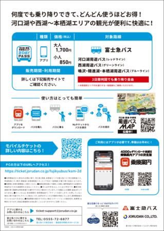 ジョルダン株式会社(本社:東京都新宿区、代表取締役社長:佐藤俊和、以下「ジョルダン」)は、富士急バス株式会社(本社:山梨県南都留郡富士河口湖町、代表取締役:古屋毅、以下「富士急バス」)が企画・運行する富士急バスの「河口湖・西湖・本栖湖エリア 2DAYPASS」を8月7日(月)よりスマホから買えるモバイルチケットで販売開始します。