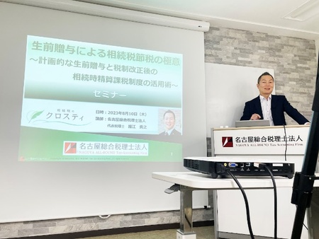 相続相談を得意とする名古屋総合税理士法人、(本社:愛知県名古屋市中区錦3丁目15番15号CTV錦ビル5F/7F、代表税理士:細江 貴之)は、2023年8月10日に同社7Fセミナールームにて、「生前贈与による相続税節税の極意~計画的な生前贈与と税制改正後の相続時精算課税制度の活用術~」と題し生前贈与による相続税節税術の解説セミナーを開催した。